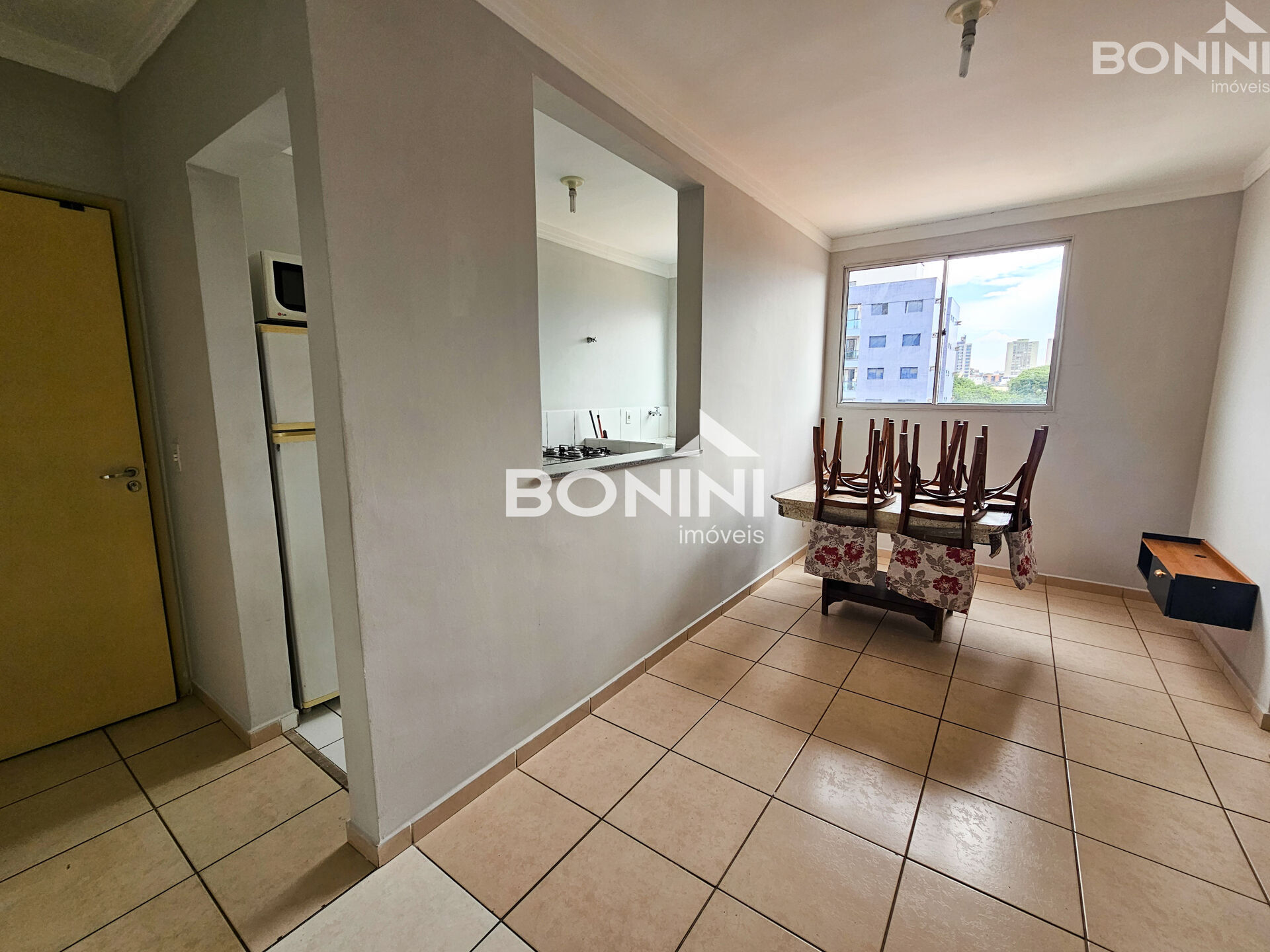 O apartamento está semi-mobiliado, com geladeira, fogão, microondas, mesa de jantar, estante na sala, camas e guarda-roupas nos quartos.